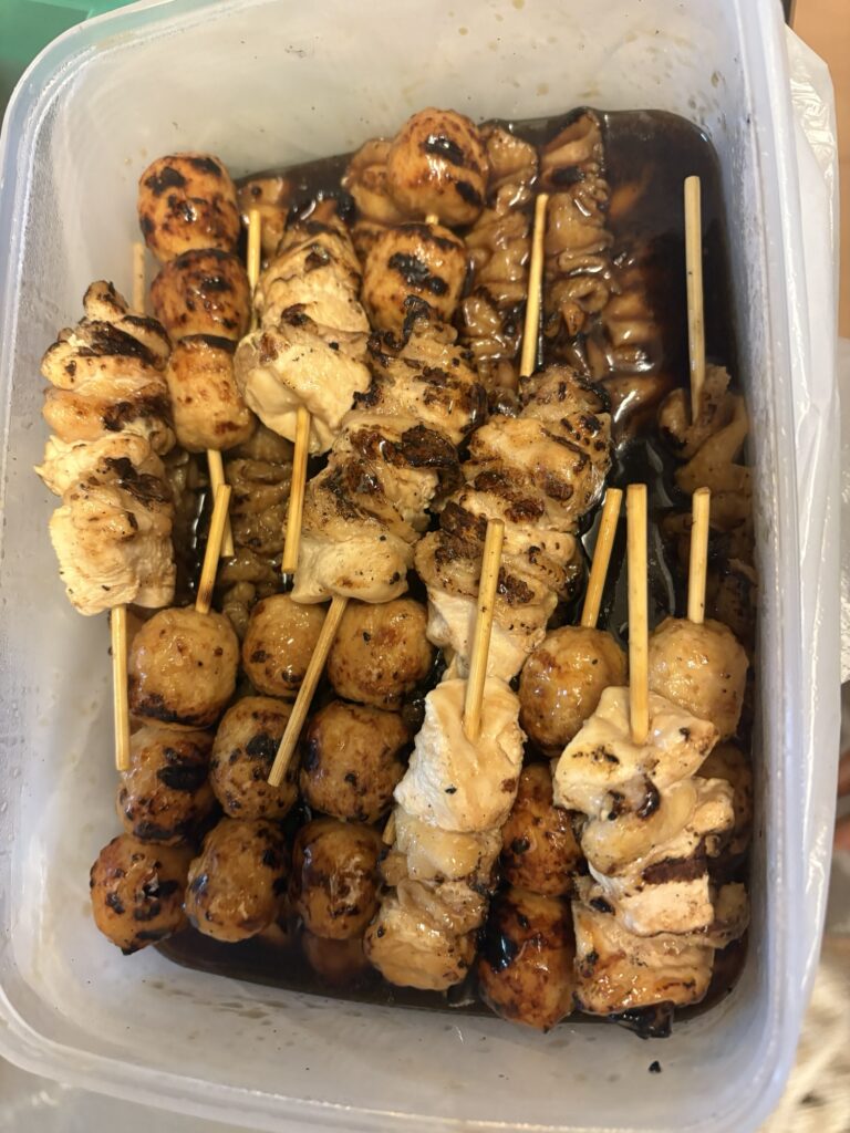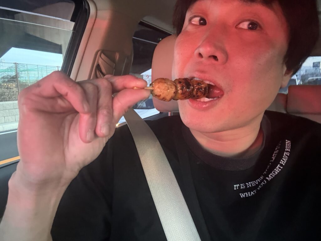 帰りの車、焼き鳥の匂いに我慢出来ず各一本ずつを食べながら帰ってきました。 笑