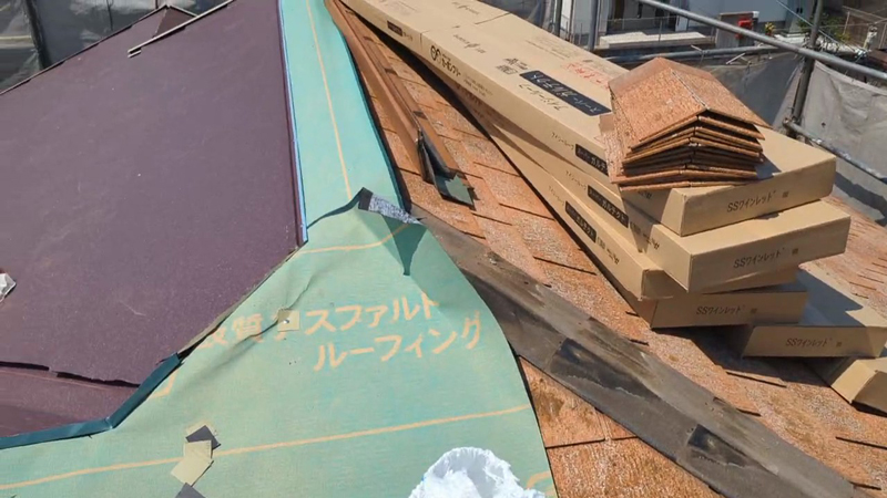 雨水の侵入を防ぐため、ルーフィングを丁寧に施工します。「普段は見えない部分ですが、雨漏りを防ぐ重要な工程です。