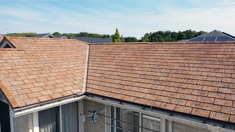 ▲屋根-カラーベストの塗膜の劣化が進んでおりました。一部、破損している箇所も見受けられ、棟押さえの留まりが甘くなっている箇所もありました。