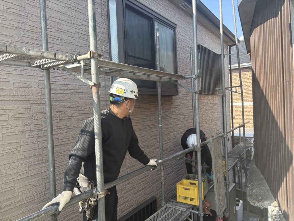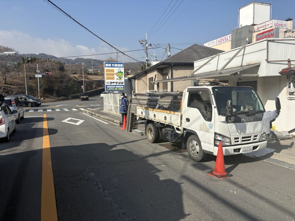 足場組み立て時には、しっかりガードマンさんに来ていただき、安全に歩行者さんや車の誘導をしていただきました。😊