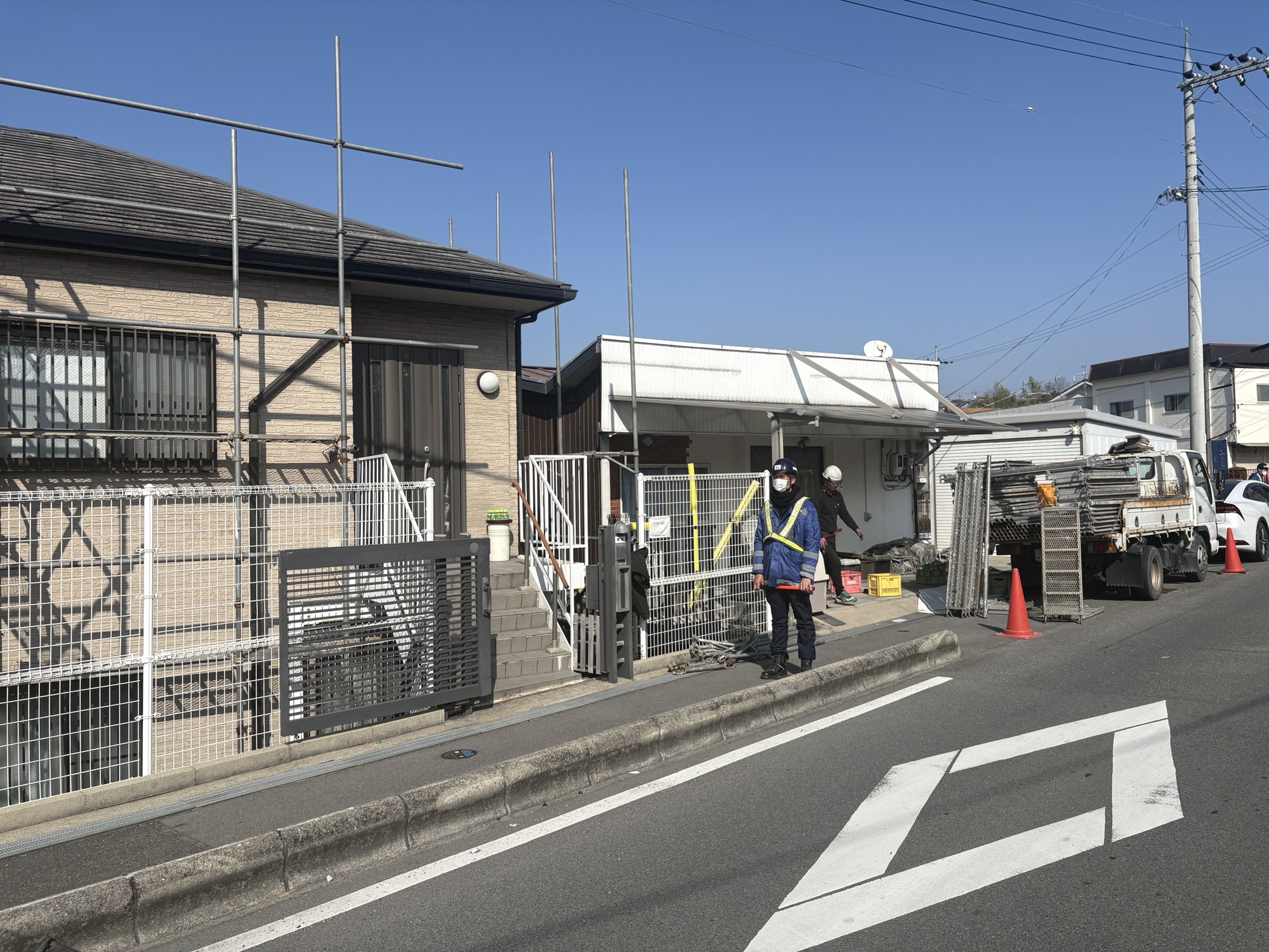 足場組み立て時には、しっかりガードマンさんに来ていただき、安全に歩行者さんや車の誘導をしていただきました。😊